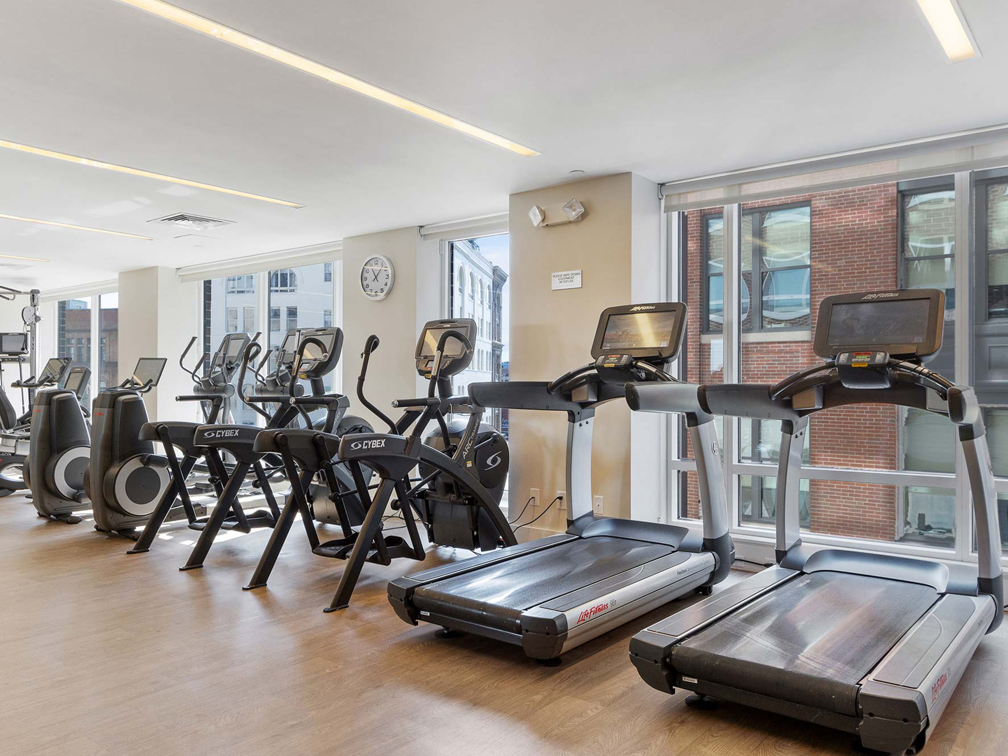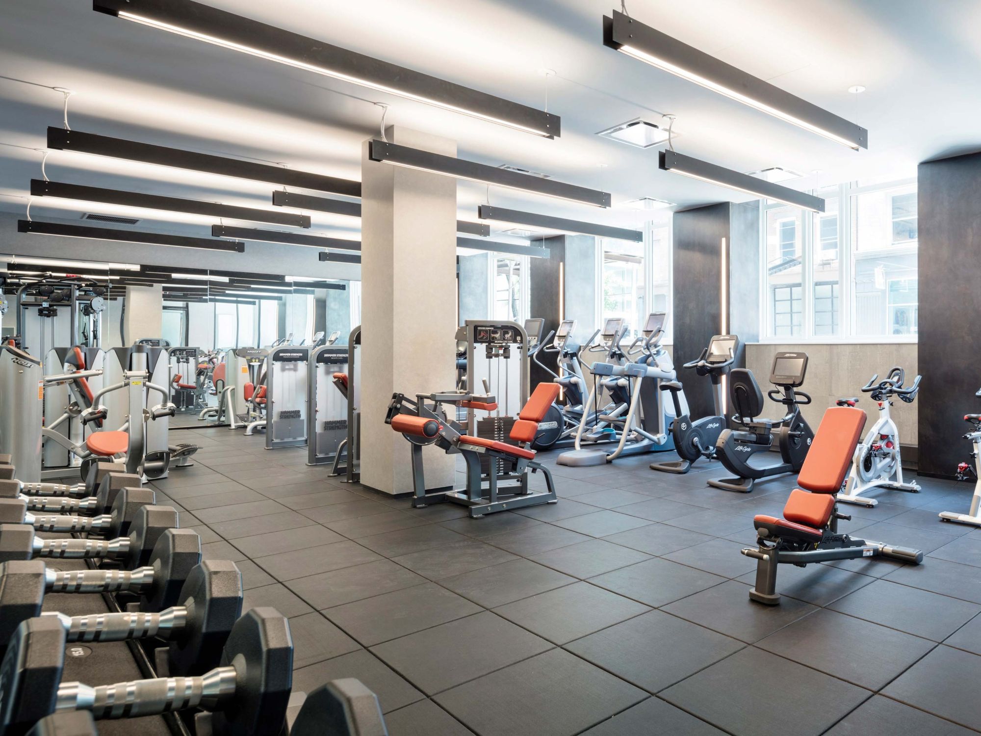 456 Washington St.’s on-site Equinox fitness center boasts cheerful orange-accented equipment and an abundance of weight and cardio options. 456 Washington St., New York, NY 10013