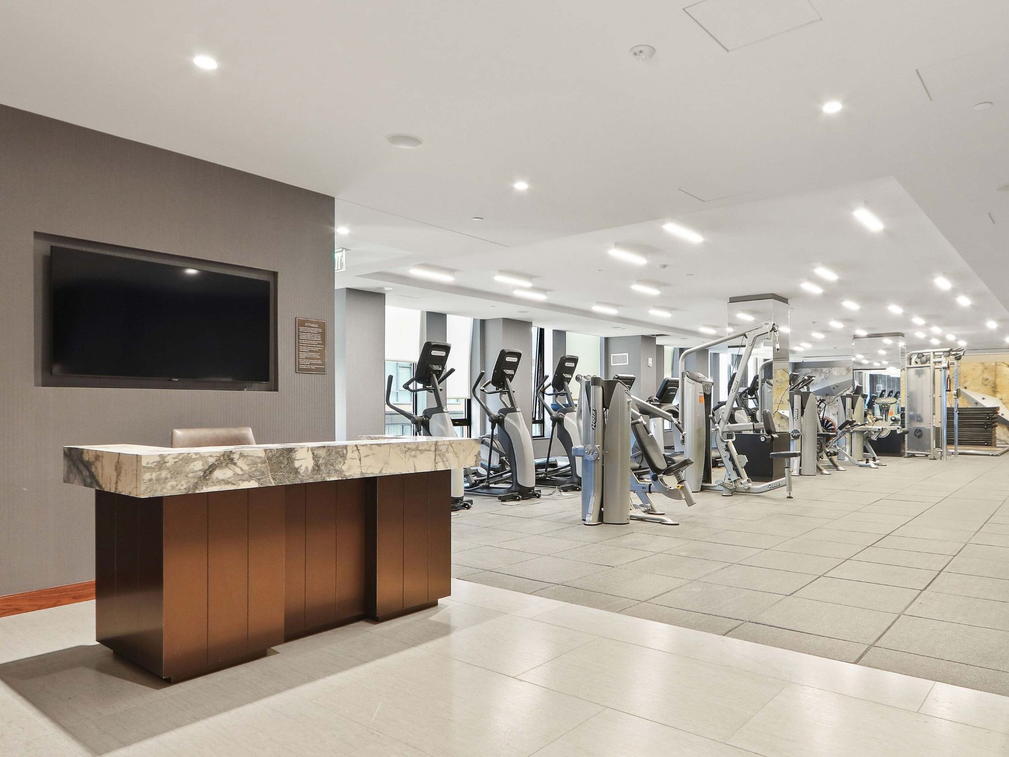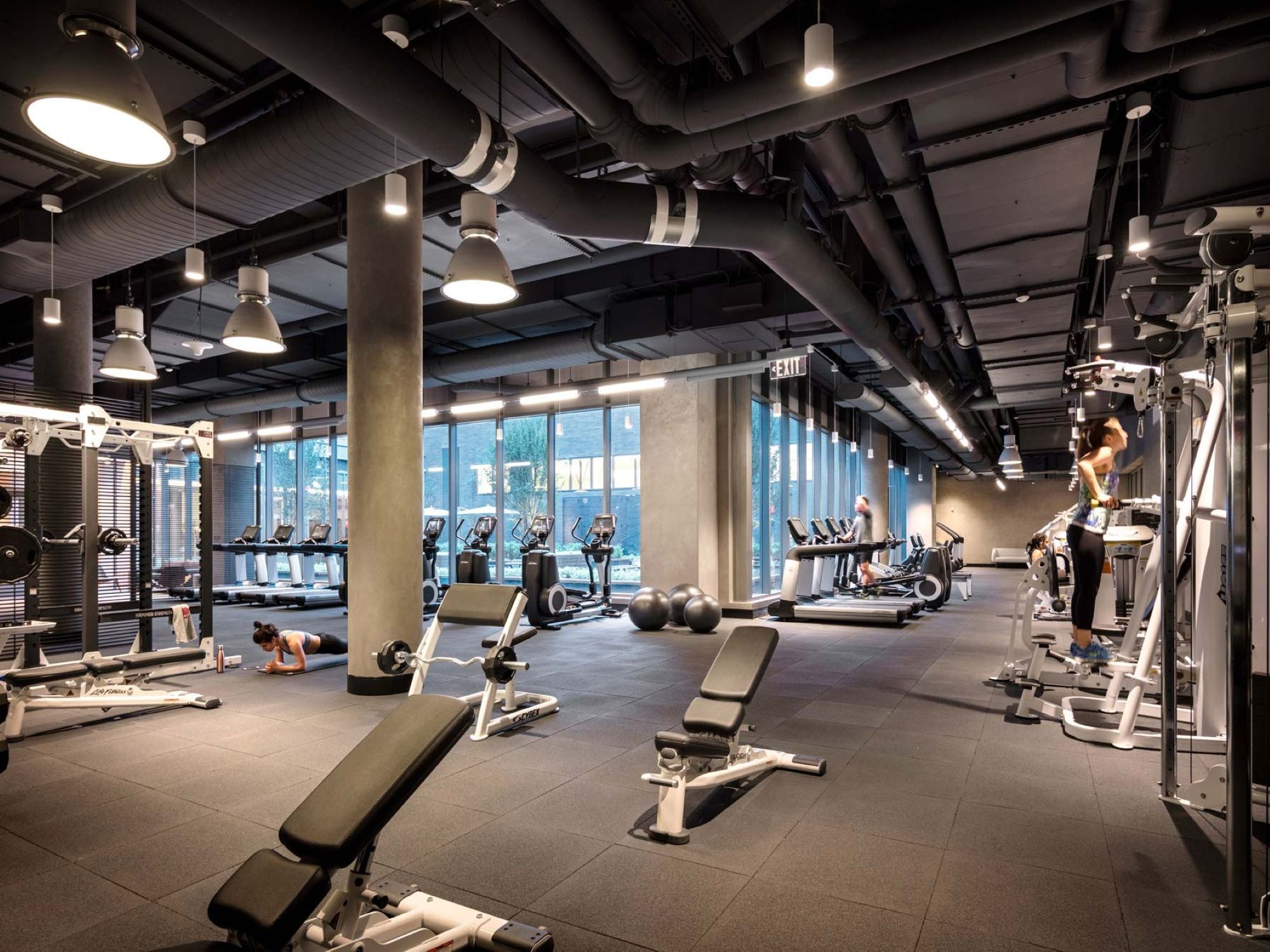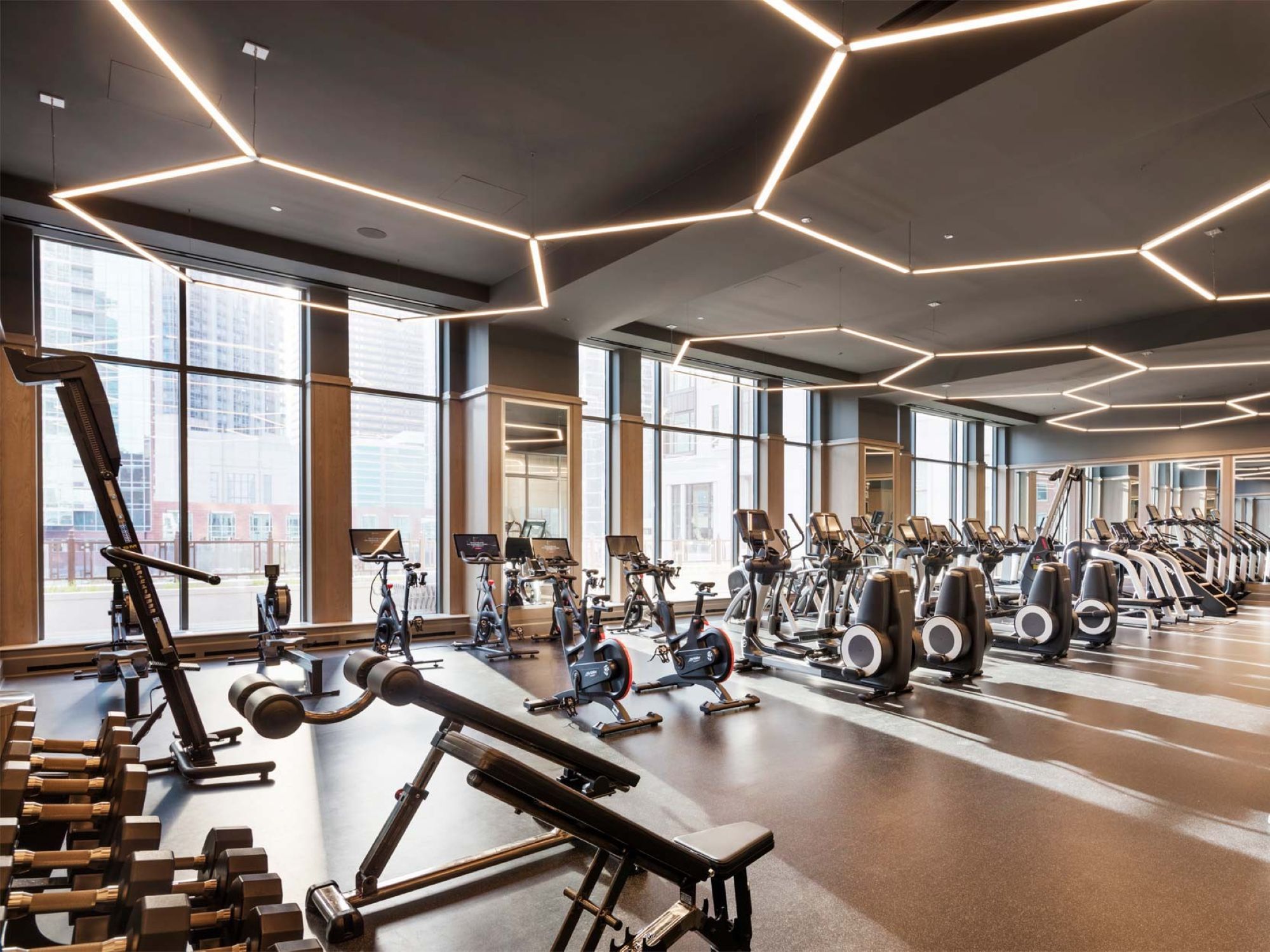 Residents at One Bennett Park enjoy access to an on-site Equinox fitness center featuring modern honeycomb-style lighting, floor-to-ceiling windows, and top-of-the-line workout equipment. 514 N. Peshtigo Ct., Chicago, IL 60611