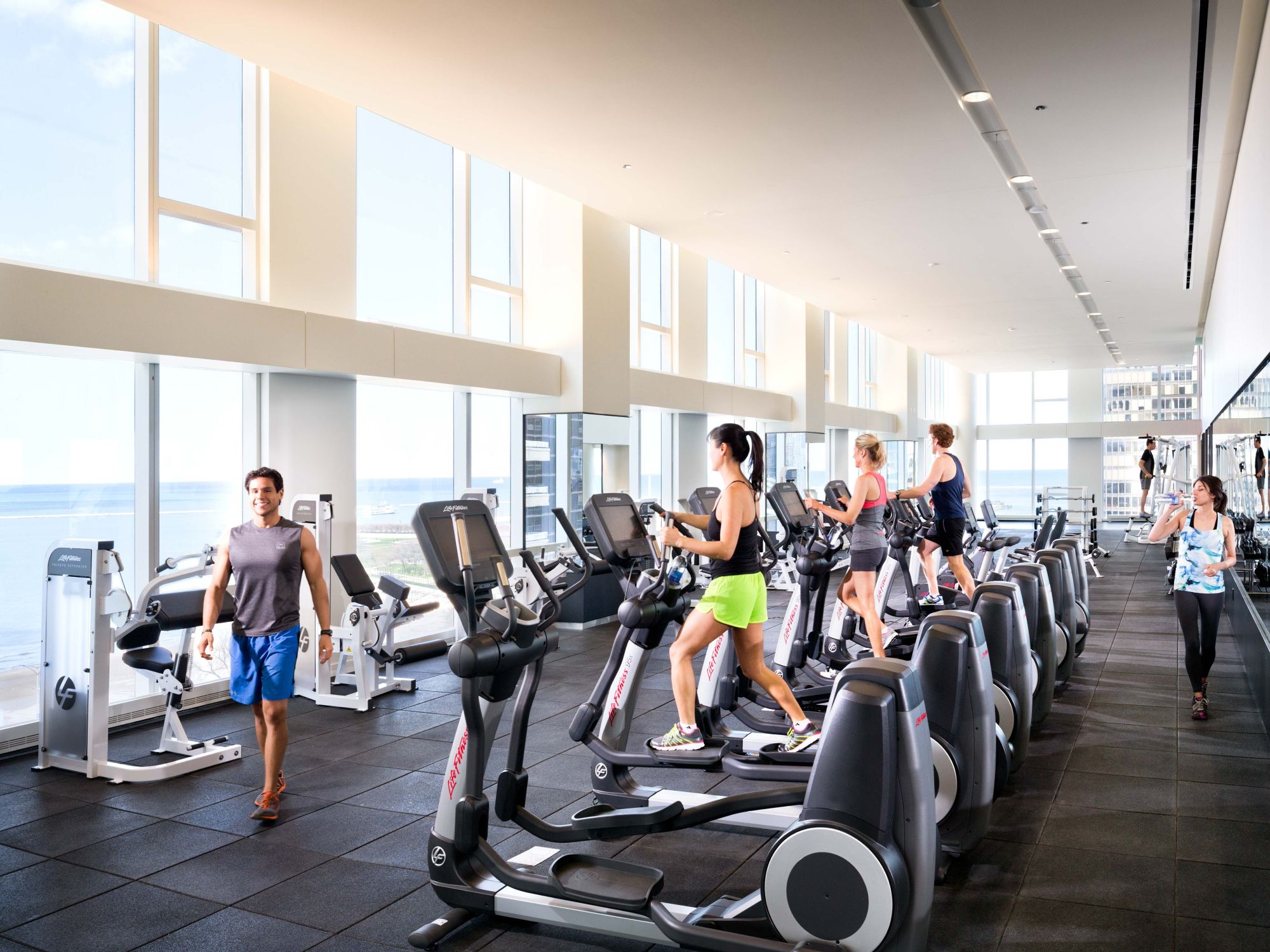 Working out feels luxurious at 500 Lake Shore Drive’s fitness center, featuring cardiovascular, strength, and training equipment by Equinox. High, airy ceilings and sunny, floor-to-ceiling windows add to the elevated feel of the space. 500 N. Lake Shore Dr., Chicago, IL 60611