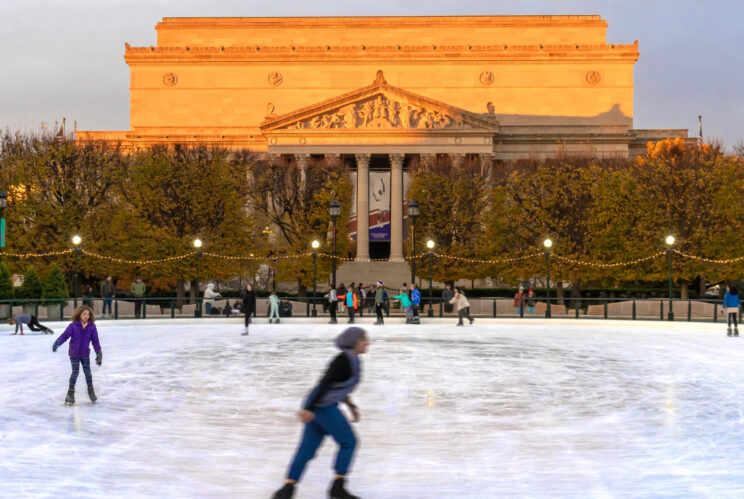 Through March 1, 2026 (weather permitting), the National Gallery of Art hosts its Ice Rink at the Sculpture Garden. Skaters will enjoy gliding on ice under views of the iconic National Gallery of Art and its surrounding white lights by night.